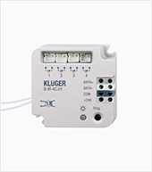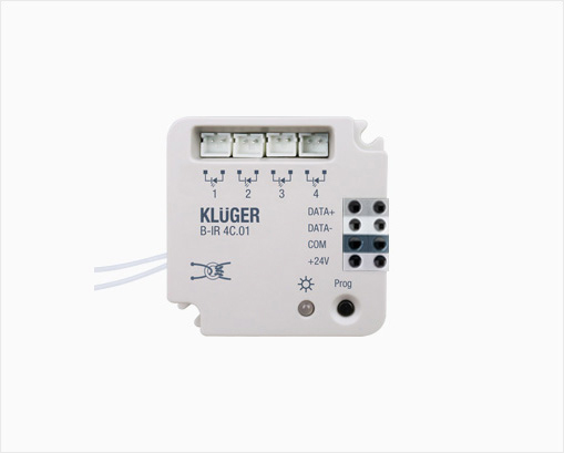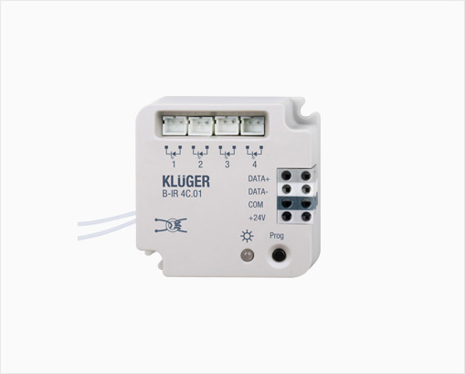 B-IR 4C.01 is a -4fold Infrared emitter, which can simultaneously emit IR codes from each of the 4 outputs. The IR codes are available in the IR database or learnt with the Klüger IR Learner and saved in the Klüger Programming Software. The IR Emitter can be used to control IR based equipment such as AC, TV, Fans and so on.