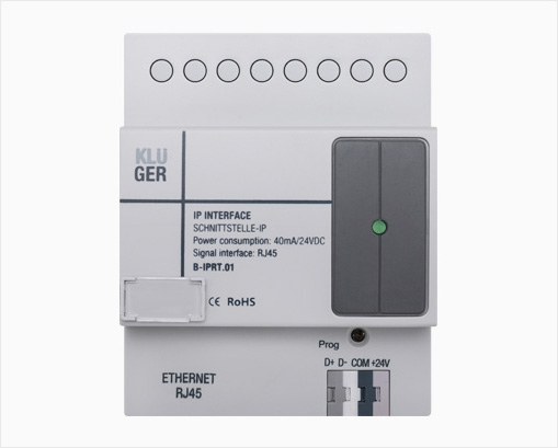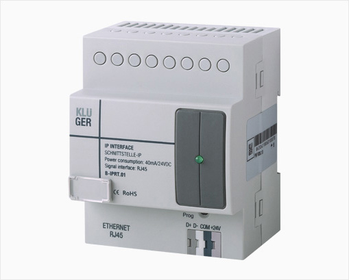 The B-IPRT.01 module enables gateway communication between the Klüger bus and an Ethernet connection. This gateway enables a remote server connection, which then allows remote programming and system configuration from anywhere in the world. The access can also be localised to the devices directly linked to the Ethernet system, this option enables users to choose the connection that best fits their needs.